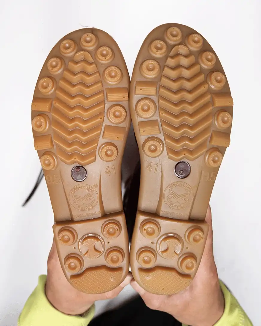 - พื้นรองเท้าสีส้มสดใส ออกแบบมาเพื่อการยึดเกาะสูงสุด (Anti-slip) ป้องกันการลื่นไถลในพื้นที่เปียกแฉะหรือดินโคลน