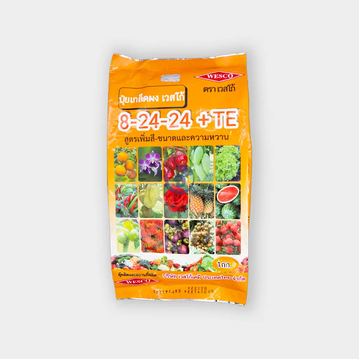 ปุ๋ยเกล็ด 8-24-24+TE ตราเวสโก้ 1kg. สูตรเพิ่มสี ขยายขนาด และความหวาน ช่วยสะสมอาหารเพื่อการออกดอก ผลผลิตน้ำหนักดี รสชาติเข้มข้น