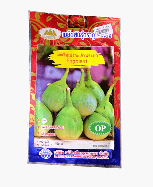 ซองเมล็ดพันธุ์มะเขือเปราะเจ้าพระยา-Thai-Eggplant-ตราภูเขาทอง-หน้าซองแสดงรูปผลมะเขือทรงกลมสีเขียวอ่อนมีลายทางสีขาว-ขั้วยาว-ติดผลดก-รสหวานกรอบ